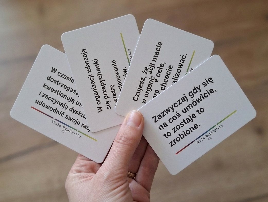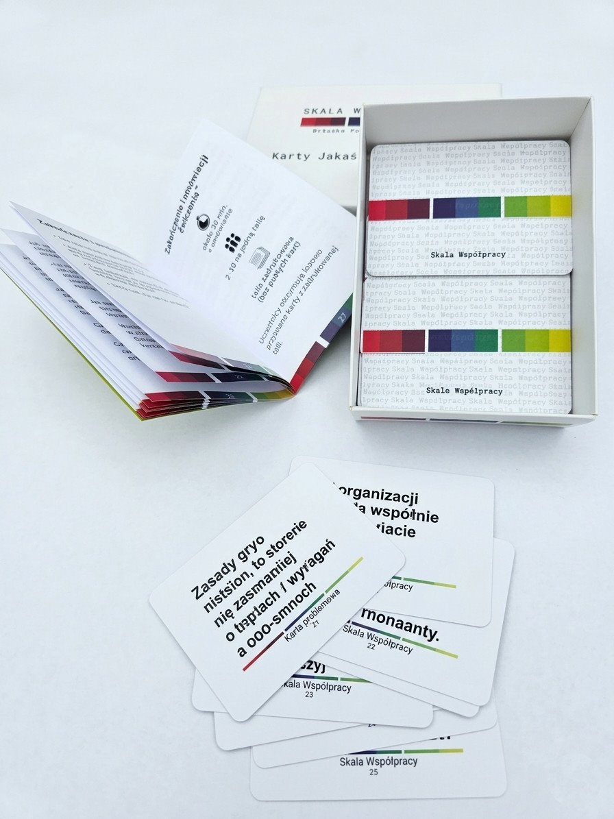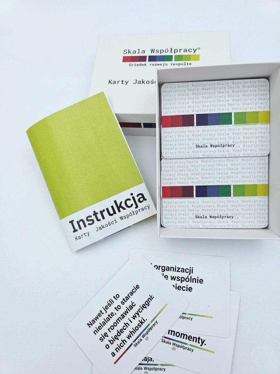 Karty Jakości Współpracy to zestaw kart wraz z ćwiczeniami, który pozwolą z grupy osób zbudować współdziałający zespół. Szkolenia dotyczące współpracy i integracji zespołu zwykle bazują jedynie na rozrywce i niewiele zostaje w nich miejsca na dociekanie co dla tych konkretnych osób oznacza współpraca? Jakie są ich potrzeby? Co w tej chwili się sprawdza w zespole, a co jest przeszkodą do celu jakim jest współpraca pozwalająca działać efektywnie ale i z satysfakcją?Narzędzie jest przeznaczone do pracy z zespołami, które ze sobą współpracują, ponieważ bazuje ono na już posiadanych doświadczeniach i preferencjach,