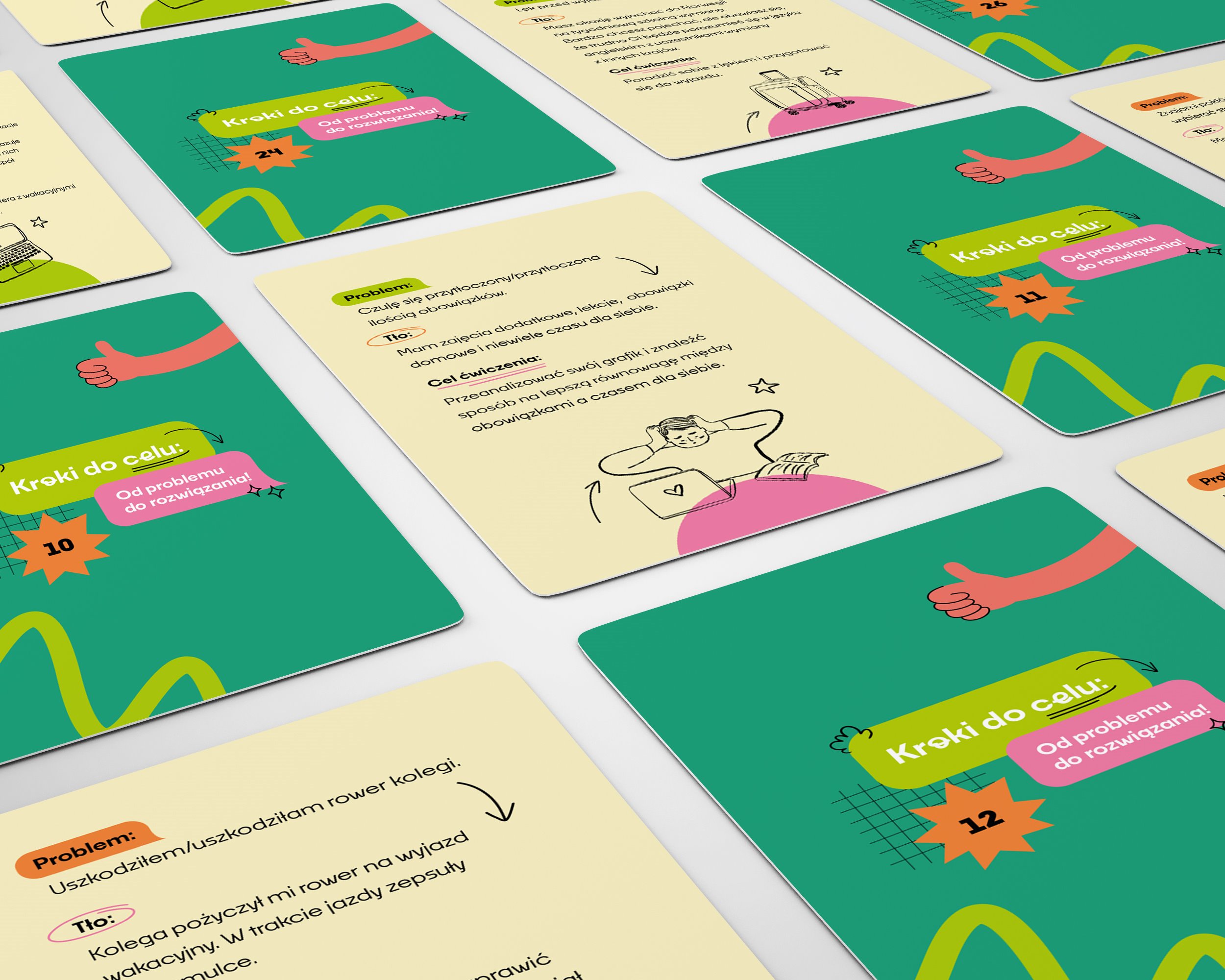Gra psychoedukacyjna do radzenia sobie z lękiem, obniżonym nastrojem i codziennym stresem. Przeznaczona jest do pracy z młodzieżą.Narzędzie, które przekłada protokół Problem Solving Skills Training na język zrozumiały i angażujący dla młodzieży. Zamiast teoretyzować o strategiach radzenia sobie z lękiem, stresm i wyborem, dajemy młodym ludziom szansę na bezpieczne przetrenowanie.