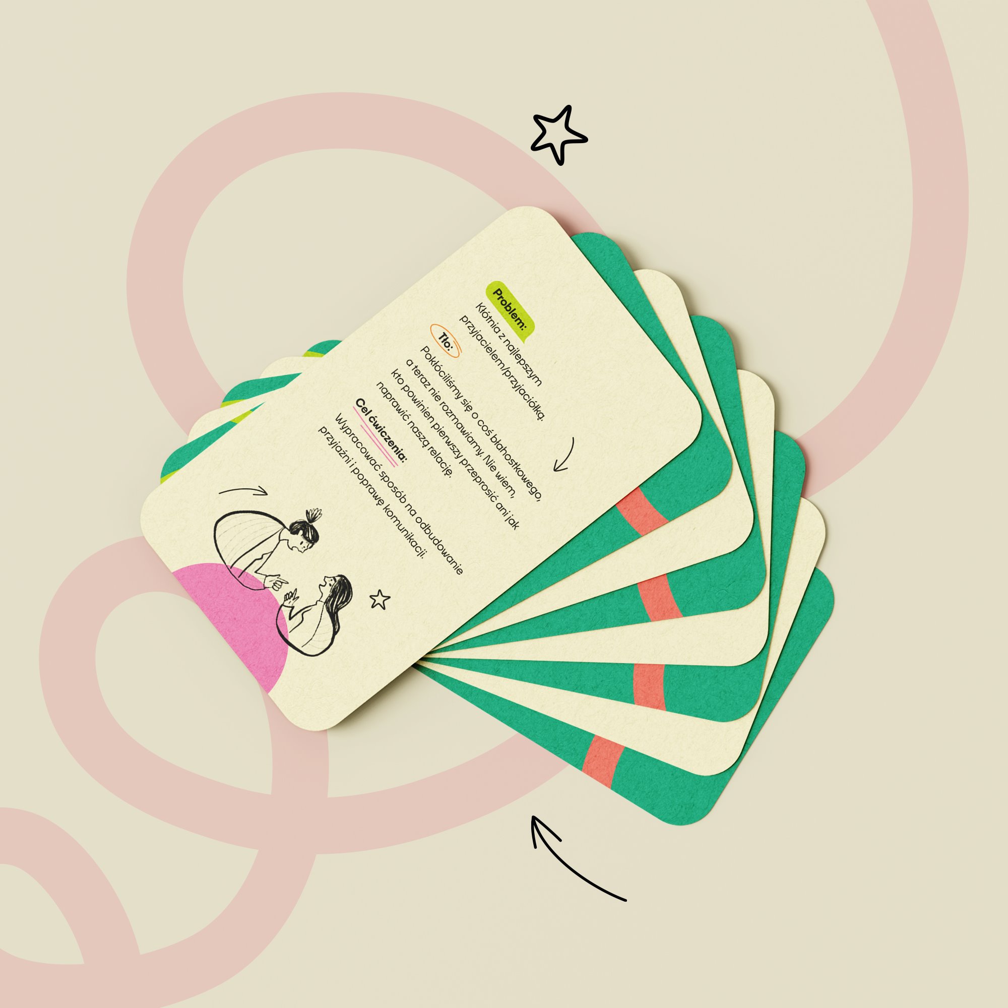 Zestaw został zaprojektowany z dbałością o każdy detal, aby angażować i ułatwiać pracę:- 34 karty z realistycznymi problemami: Scenariusze bliskie życiu – od kłótni o komputer po wybór szkoły średniej.