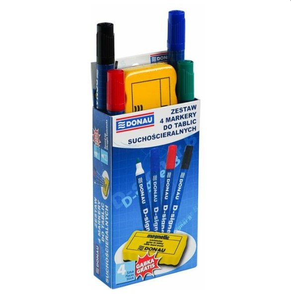 Zestaw 4 markerów w podstawowych kolorach (czarny, niebieski, czerwony, zielony) marki Donau + gąbka do tablic suchościeralnych..Markery suchościeralne odpowiednie do: