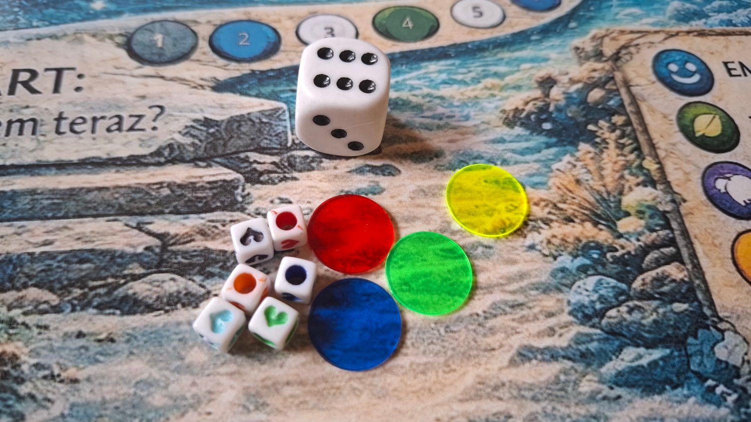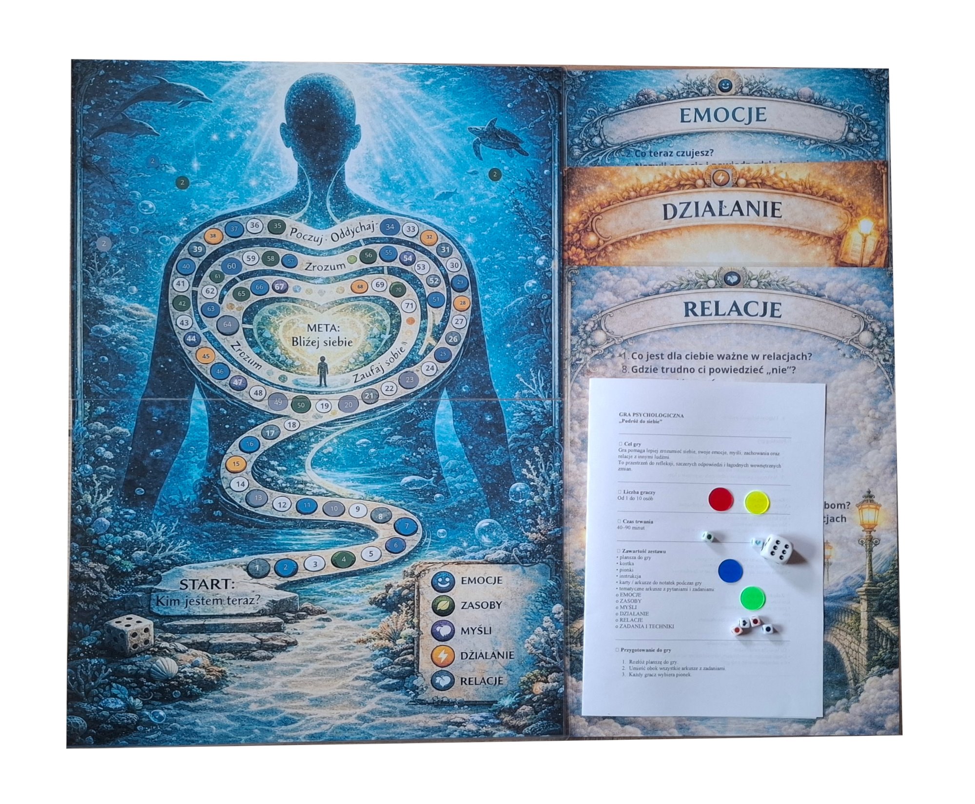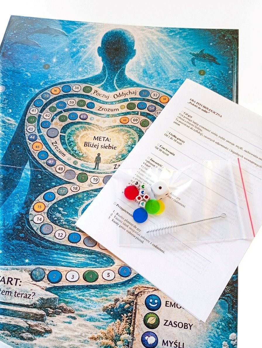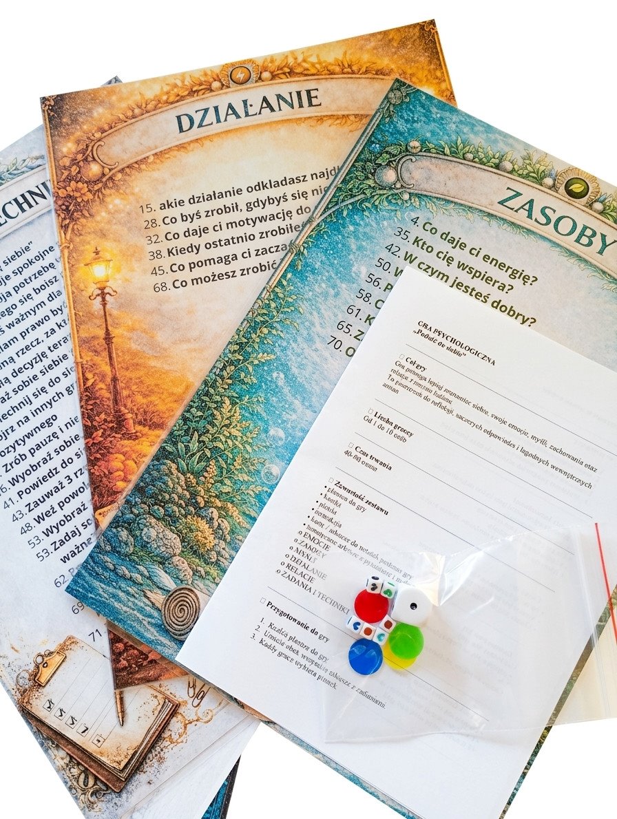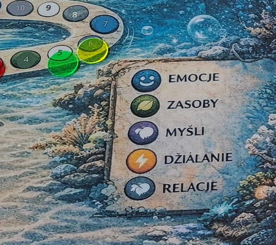 Uczestnicy (od 2 do 10 osób) rzucają kością i przesuwają swoje pionki po planszy. Pola na których się zatrzymują mają różne kolory. To te kolory odsyłają do plansz z pytaniami i zadaniami. Plansze dotyczą: emocji, relacji, zasobów, myśli, działania oraz zadania i techniki. Zadania z plansz wykonujemy kolejno. - A jakie to zadania i pytania?